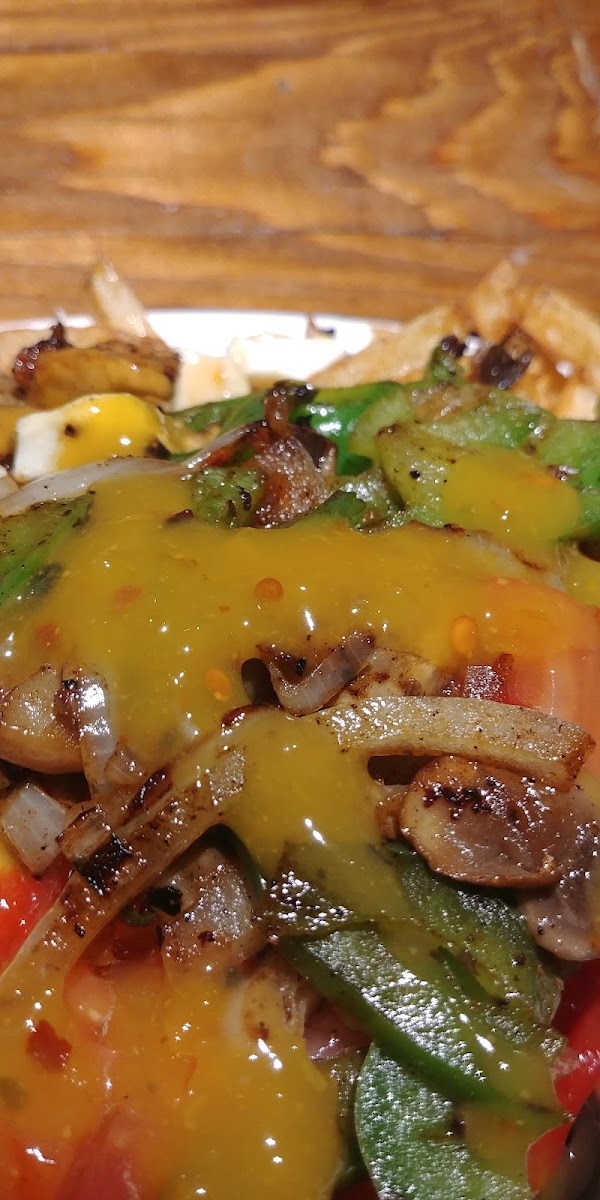 Végétarien. Champignon, oignon, poivron vert et rouge, sauce asiatika et mayo épicée. / Vegetarian. Mushroom, onion, green and red bell pepper, asian sauce and spicy mayo.